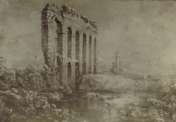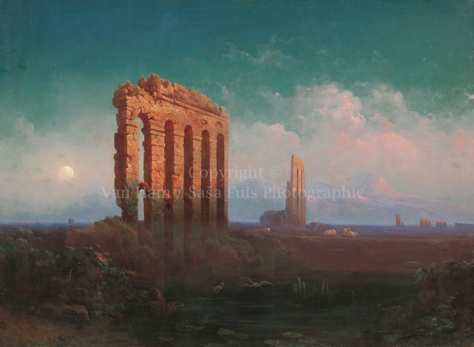 [15] „Abendstimmung in der römischen Campagna“ in Öl mit dem von Schreiber schon in der Kohlezeichnung (Abb. 13) vorskizzierten römischen Aquädukt. Datiert und signiert links unten mit „C. Schreiber 1865“. Bildnachweis: Van Ham Kunstauktionen. Foto: Saša Fuis.