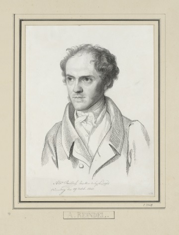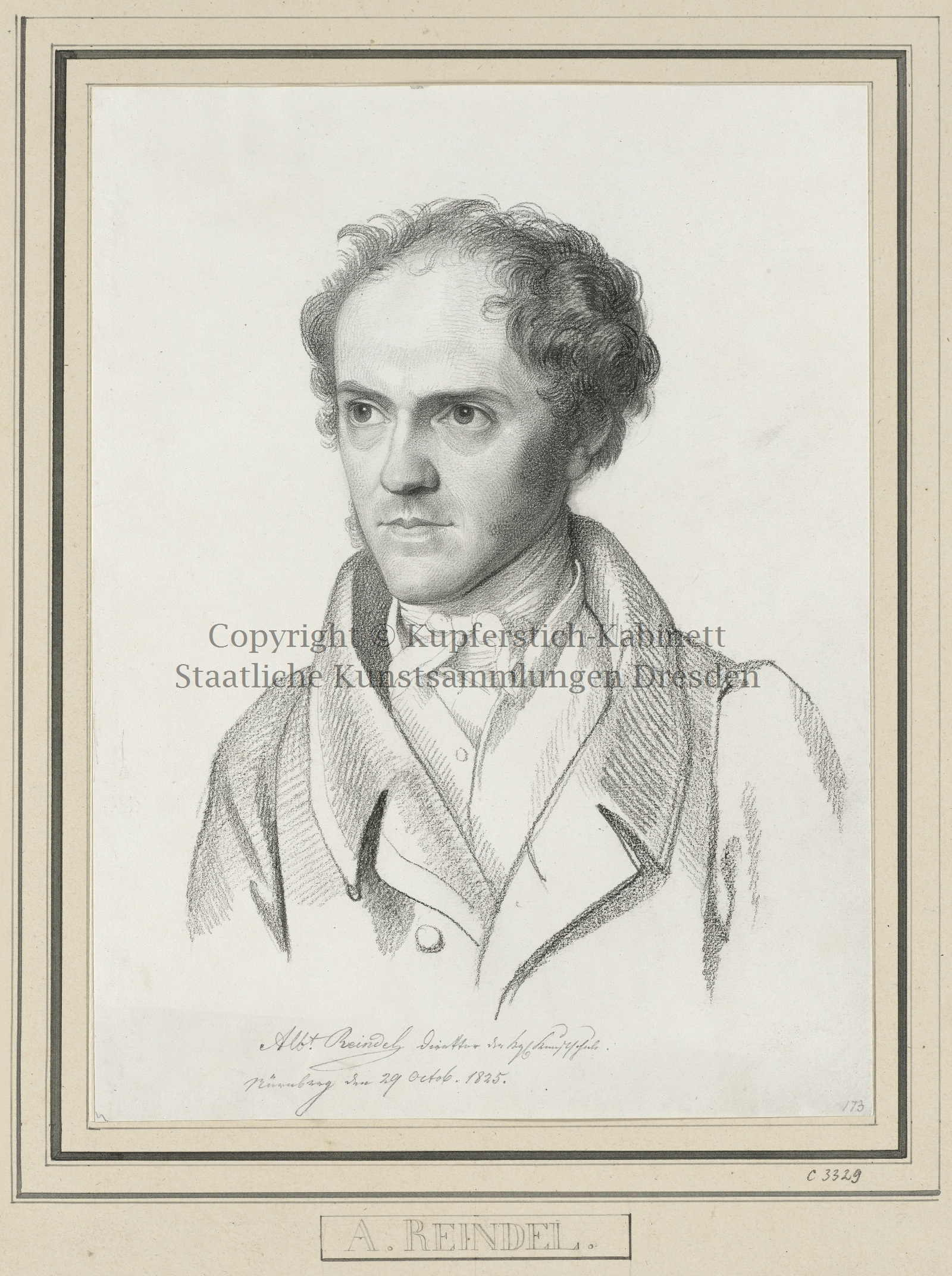 [2] Albert Christoph Reindel, Direktor der königlichen Kunstgewerbeschule zu Nürnberg und Förderer Schreibers. Die Zeichnung aus dem Jahre 1825 stammt von Carl Christian Vogel von Vogelstein. Bildnachweis: Kupferstich-Kabinett, Staatliche Kunstsammlungen Dresden. Fotograf: Herbert Boswank.