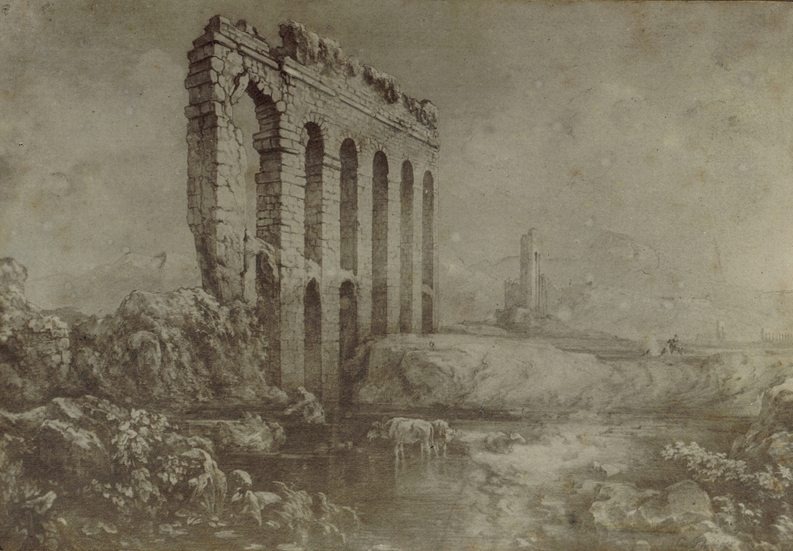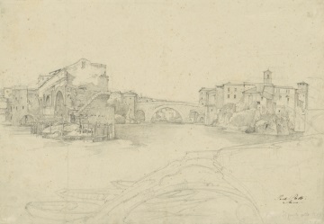 [11] „Ponte Rotto a Roma“ ist eine eigenhändig von Schreiber mit Tusche so benannte Bleistiftskizze. Darunter von fremder Hand mit Bleistift: „Il ponte rotto 1839“. Wenn die Datierung zutrifft, dann ist dies die früheste bekannte Skizze Schreibers nach Ankunft in Rom im Frühjahr 1839. Bildnachweis: Kupferstichkabinett. Staatliche Museen zu Berlin.