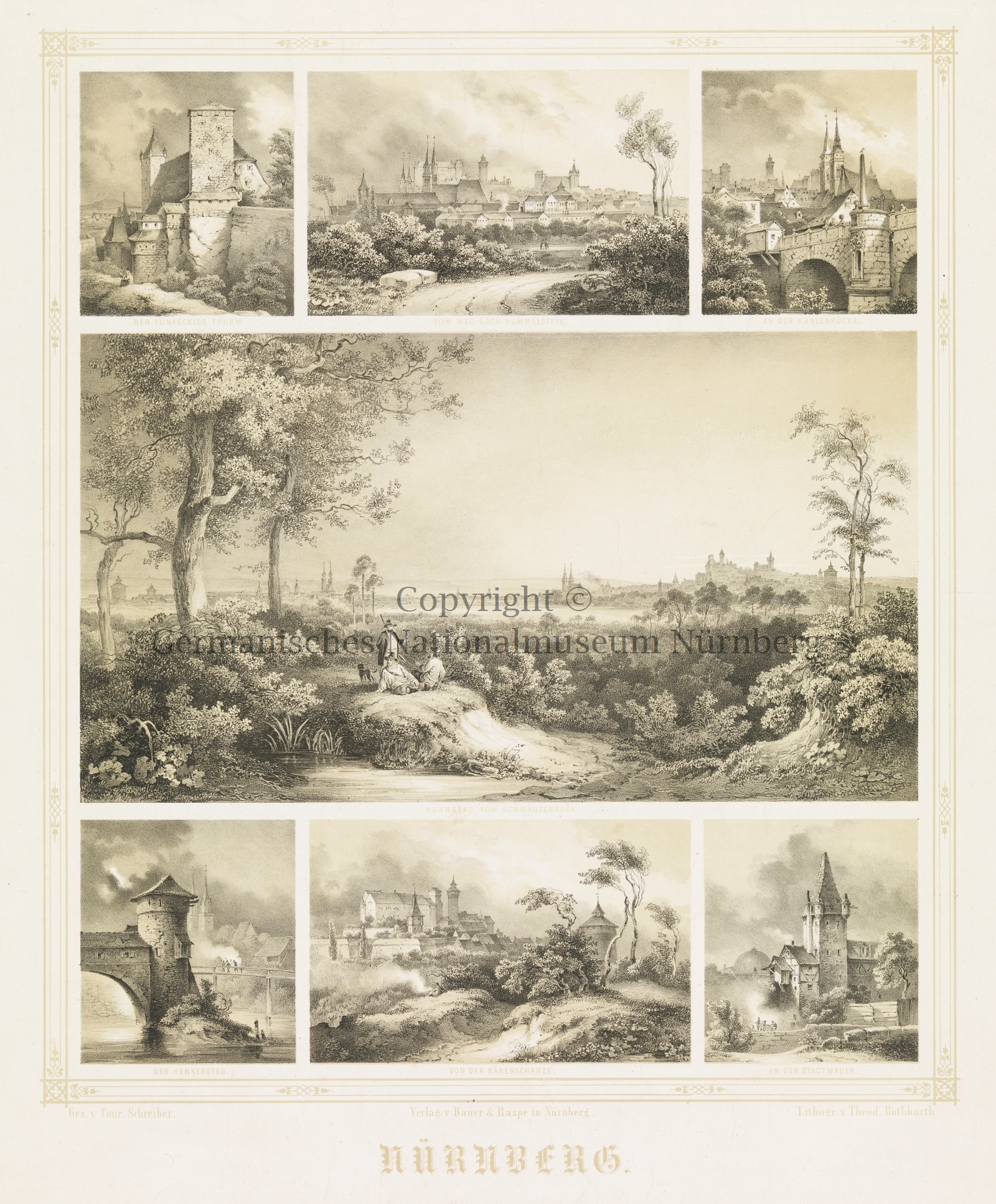[8] Die Lithografie von Theodor Rothbarth um 1850 wurde auf der Grundlage eines von Schreiber gezeichneten Panoramablicks des vorindustriellen Nürnbergs gefertigt. Im Zentrum die Kaiserburg, die von Schreiber mehrfach in Öl gemalt wurde, jedoch in keiner Ausfertigung mehr erhalten ist. Bildnachweis: Germanisches Nationalmuseum Nürnberg. Kupferstichkabinett. Graphische Sammlung. Inventarnummer: K 23363, Kapsel 1057a.