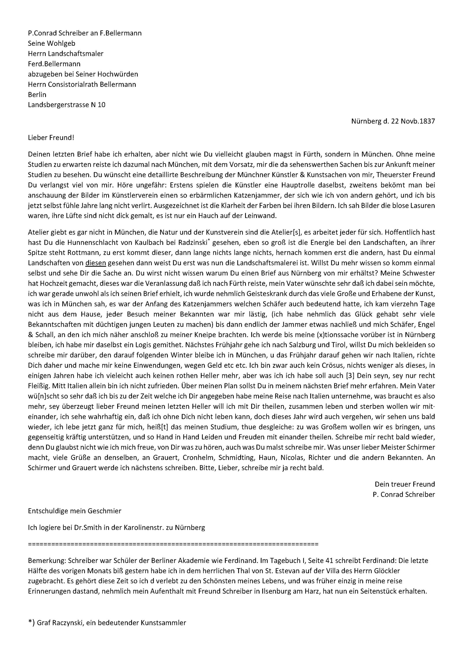Schreiber und Bellermann werden trotz der nur relativ kurzen Zeit, die sie sich in Berlin kannten, ein Leben lang Freunde bleiben. Dies erschließt sich aus den schon erwähnten drei Briefen Schreibers an Bellermann aus den Jahren 1837 (Abb. B1), 1840 (Abb. B2) und 1869 (Abb. B3). Aus den Briefen ergibt sich weiterhin, dass Schreiber auch mit seinem Lehrer Schirmer in brieflichem Kontakt blieb, ebenso mit Julius Helfft (1818-1894) und August Carl Haun (1815-1894), beide ebenfalls Schüler von Schirmer. Noch zweimal nach seinem Weggang nahm Schreiber an Akademieausstellungen in Berlin teil: 1838 unter Angabe der Wohnadresse seines Freundes Bellermann, bei dem er während der Ausstellungsdauer untergekommen sein mag. Und 1839, als er nur noch unter Angabe „aus Fürth bei Nürnberg, Schüler d. Hrn. Schirmer“ im Katalog aufgeführt war. Nach den Regularien der Akademie konnte er bei Abwesenheit einen „Beauftragten“ benennen. Dies war 1839 mit Sicherheit Bellermann. Im Herbst 1839 befindet sich Schreiber, wie noch gezeigt wird, jedenfalls definitiv bereits im fernen Rom.