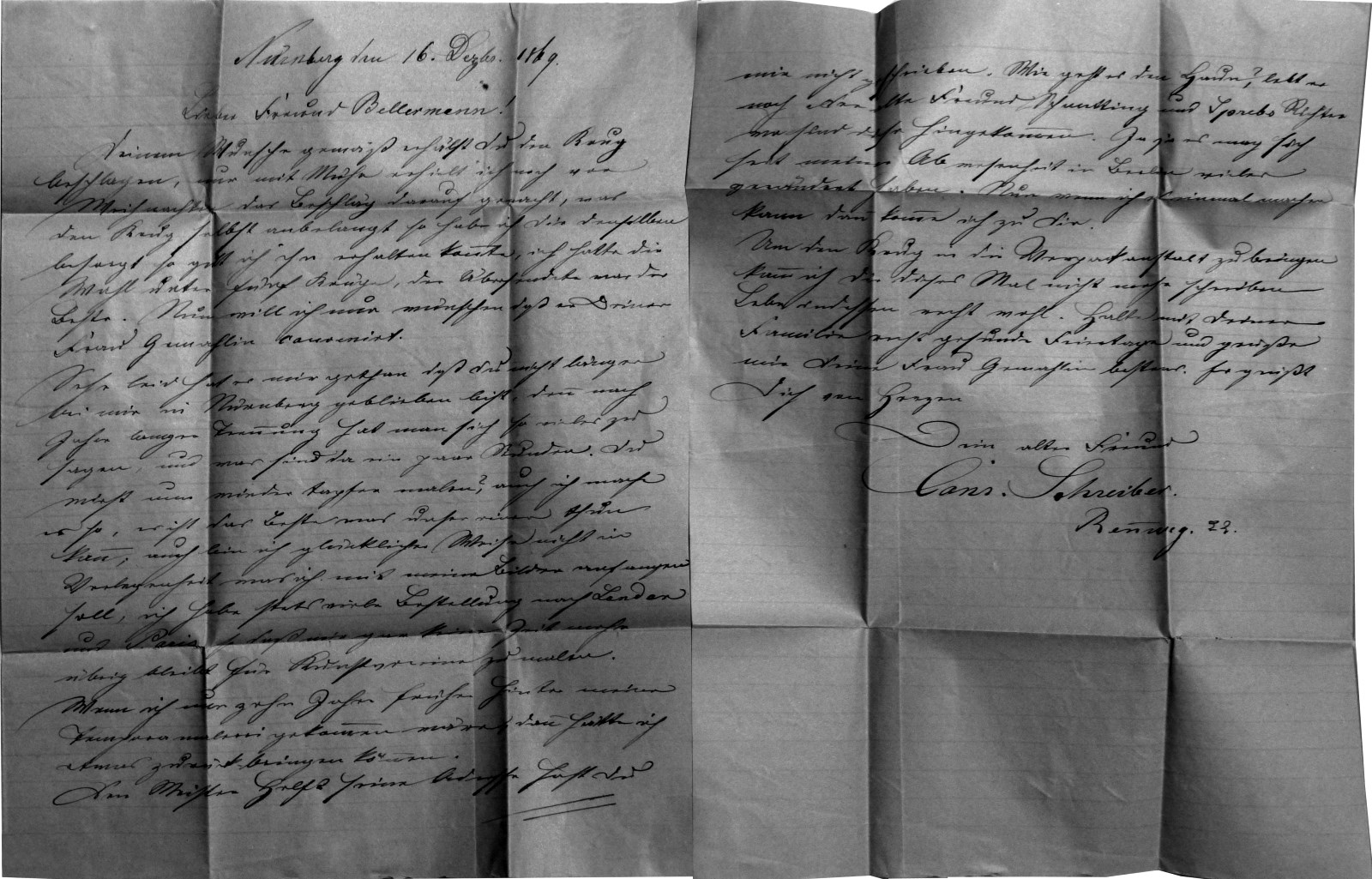 Über drei Generationen führt der im Folgenden beschriebene Weg des Künstlers vom Geburtsjahr 1816 und dem Geburtsort Fürth in das Jahr 2015/2016 und direkt nach Bremen, wo ich als der Verfasser dieser Zeilen zusammengetragen habe, was über Peter Conrad Schreiber, meinen Ururgroßvater, aus noch vorhandenen Quellen zu erfahren war. Leider hat kein Chronist je Einzelheiten über sein persönliches Leben aufgezeichnet, stellte schon 1972 Hans Pflug-Franken in einem Beitrag zu Schreiber in den Fürther Geschichtsblättern mit Recht fest. Auch ist bislang kein nennenswerter schriftlicher Nachlass Schreibers gefunden worden. Eine besonders wichtige Quelle über sein Leben und Schaffen ist daher die bisher noch nicht ausgewertete Niederlassungsakte im Stadtarchiv Nürnberg aus dem Jahre 1845. Aus dieser Akte, die manchen unbekannten Aspekt zu Schreibers Leben enthält, wird im Folgenden, vor allem auch in Teil 2, häufiger zitiert. Sie befindet sich daher auch als einzeln aufgeführte Dokumentation auszugsweise im Anhang. Hinzukamen 2016 drei Briefe Schreibers aus den Jahren 1837 (Abb. B1), 1840 (Abb. B2) und 1869 (Abb. B3) an Ferdinand Bellermann, einen Mitschüler und Freund aus Berliner Zeiten. Die Briefe wurden mir 2016 von Thomas von Taschitzky, dem Kurator der Gemälde- und Skulpturensammlung des Angermuseums Erfurt, dankenswerterweise zur Kenntnis gebracht. Der Ururenkel von Ferdinand Bellermann, Dr. Martin Bellermann, genehmigte den Abdruck. Die Briefe wurden daher in diesen Text eingearbeitet. Sie sind in Anhang 1-3 komplett als Texte nachzulesen. Im ersten Teil der Ausführungen geht es um Schreibers Kindheit und Jugendzeit in Fürth, aber auch um die für sein Schaffen so wichtigen anschließenden Studien- und Wanderjahre in Berlin, München und Rom[1]. Der zweite Teil beschreibt sein Leben und Schaffen in Nürnberg. Eine fundierte kunsthistorische Bearbeitung des Werks bleibt ein großer Wunsch, der allerdings nur von Expertenseite zu erfüllen wäre. Möge diese Homepage, in der auch diese Arbeit über Schreiber Aufnahme fand, ein Ansporn sein.