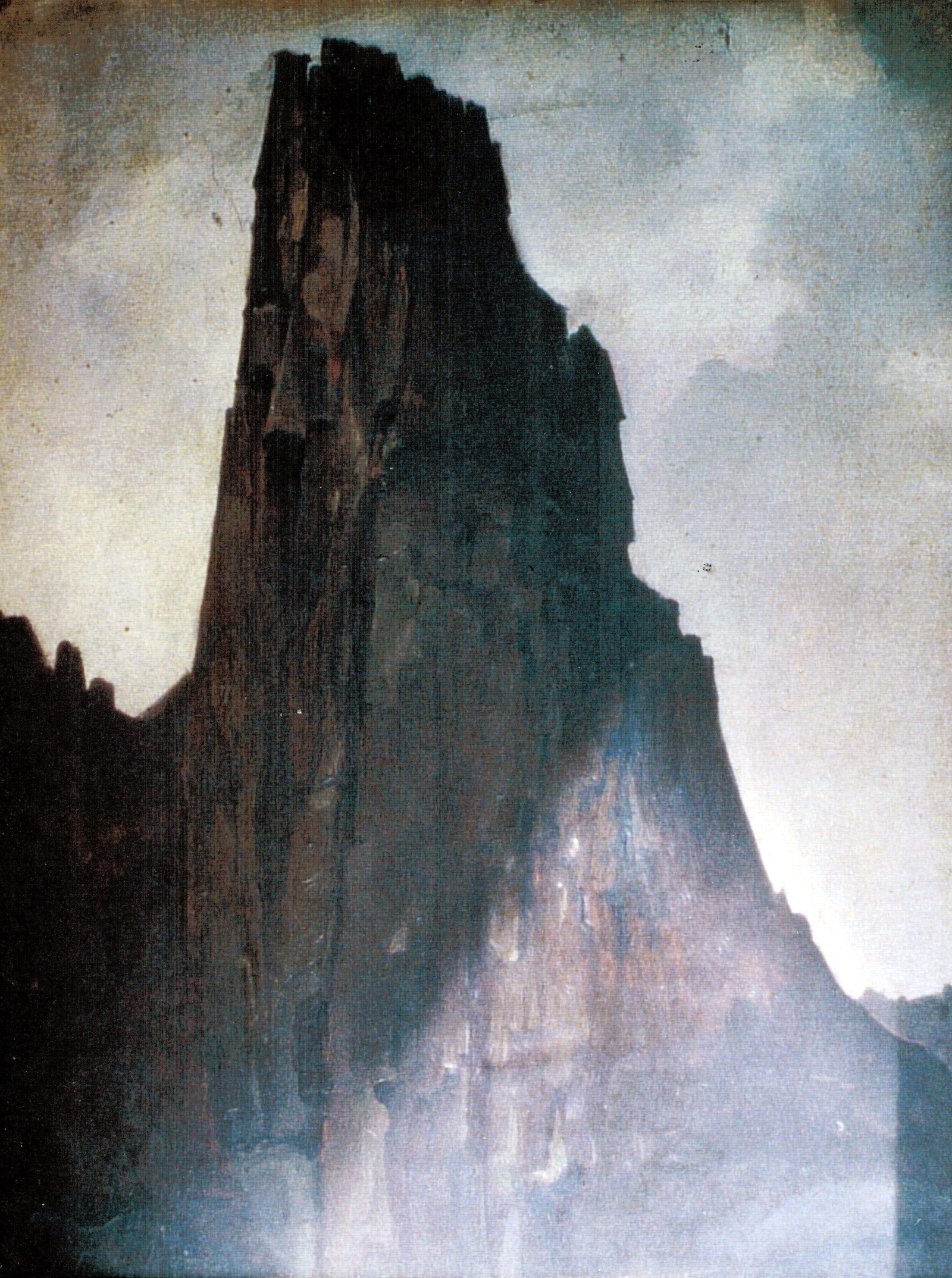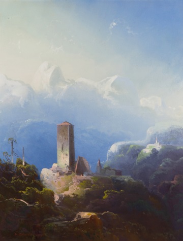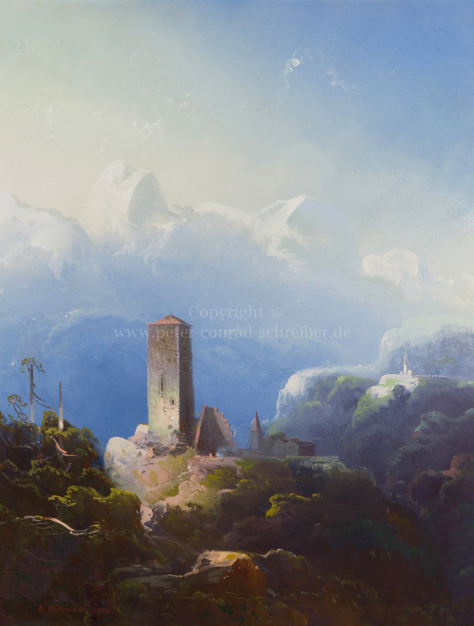[9] Italienische Gebirgslandschaft mit Bergturm. Unten links signiert und datiert: C. Schreiber, 1875. Berge lösten im damaligen Betrachter zwiespältige Gefühle aus: man empfand sie als bedrohlich und erhaben zugleich. Diesen Zwiespalt der Gefühle nutzt der Maler. Bildnachweis: Privatbesitz.