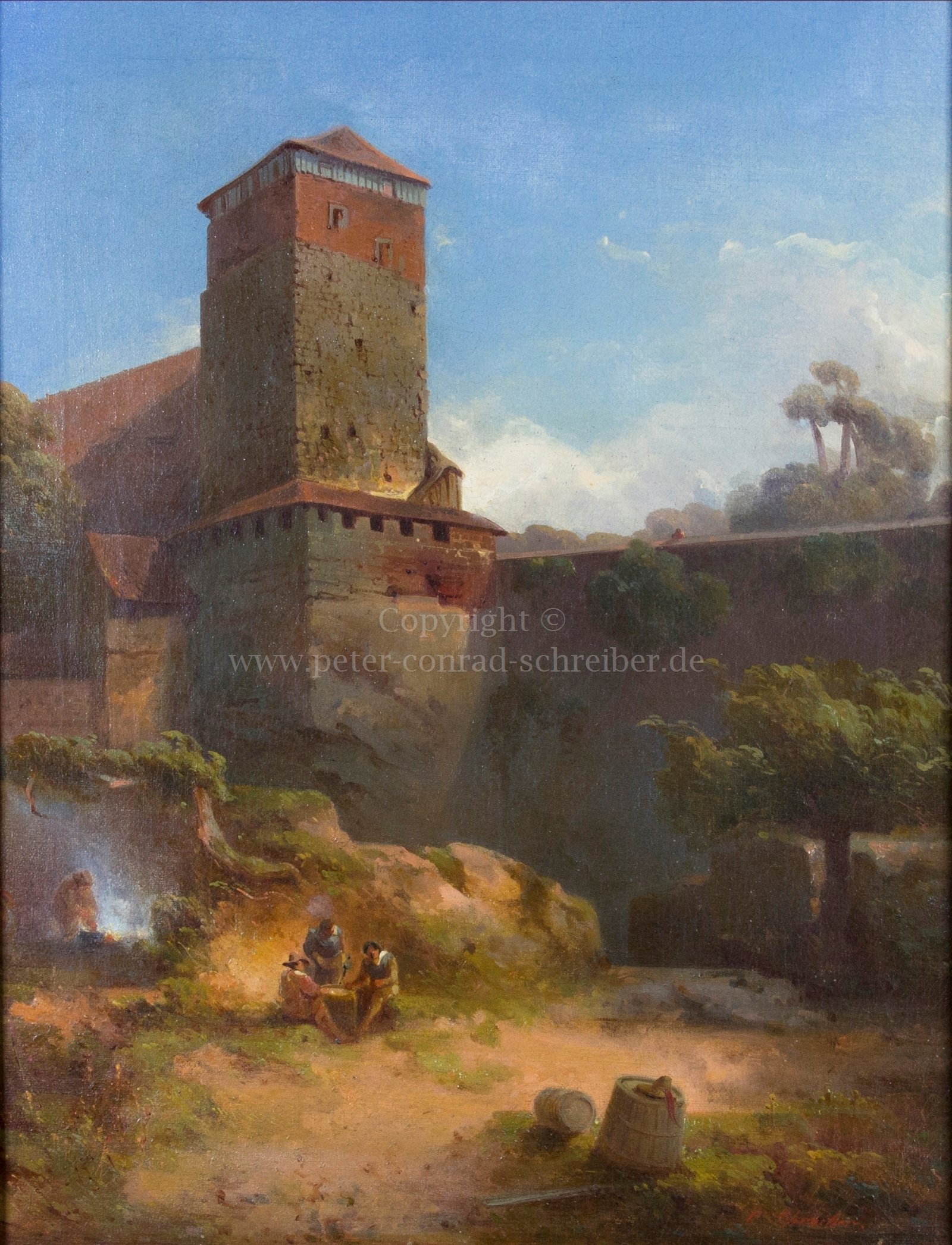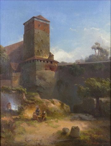 [26] Der Fünfeckturm der Nürnberger Burg mit Wächtern im Burggraben“ dürfte um 1856 entstanden sein. Eine entsprechend datierte Version vom Fünfeckturm gibt es auch in der Bayerischen Staatsgemäldesammlung in München. Das Gemälde ist ein Beispiel dafür, wie der Künstler sein Motiv bis in die Details minutiös ausarbeitet, aber trotzdem freier malt, als dies etwa zur Zeit des Biedermeiers der Fall war. Er unterscheidet sich damit gleichwohl wesentlich von seinen zahlreichen italienischen Bildern, zu denen etwa der Golf von Baja gehört (Abb. 16). Bildnachweis: Privatbesitz.