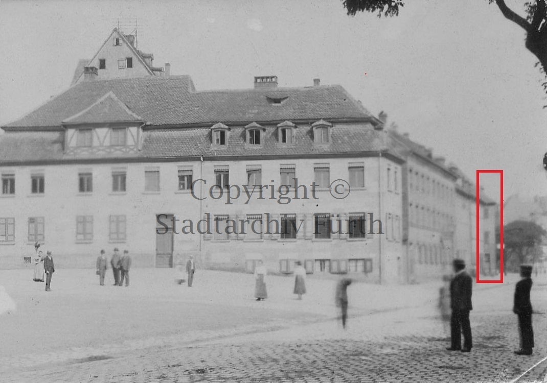 [1] Im Vordergrund: die ehemalige Brauerei Timmich und spätere Braustätte der Brauerei Mailaender; rechterhand ein Blick in die alte Nürnberger Straße, ab 1827 in Königstraße umbenannt; rot markiert: die Ecke des Geburtshauses Peter Conrad Schreibers, das aus der Häuserfront heraussteht. Das gesamte Viertel einschließlich Geburtshaus von Schreiber wurde 1901 im Zuge der Errichtung des neuen Stadttheaters abgerissen. Bildnachweis: Stadtarchiv Fürth.