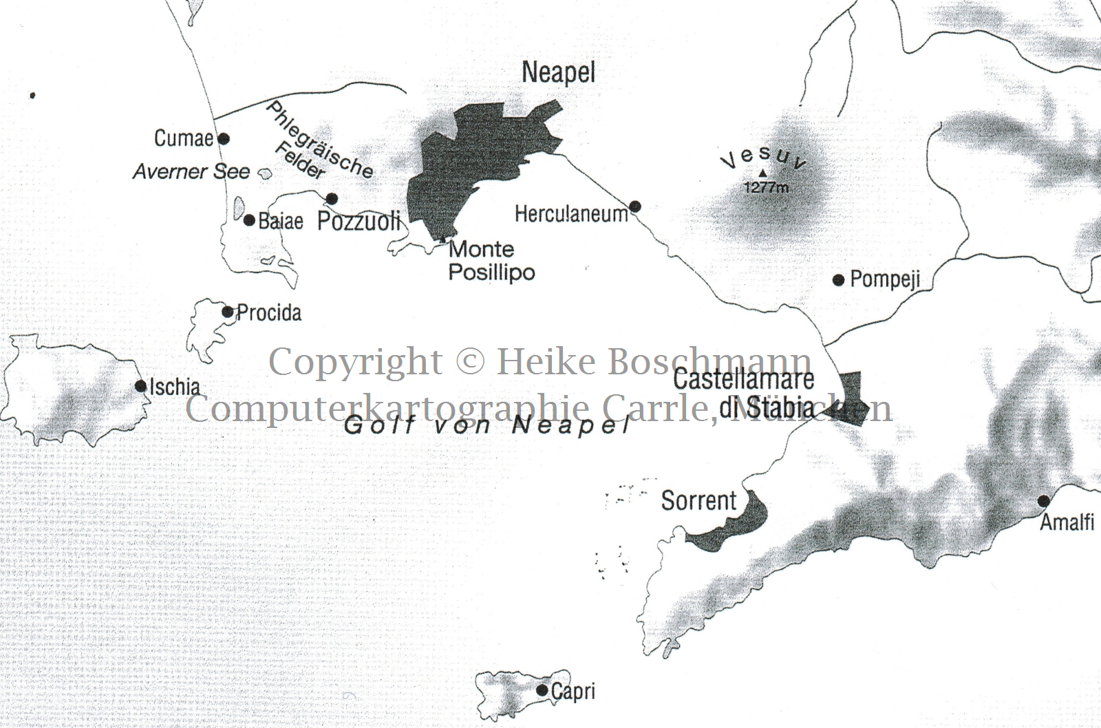 [17] Die Neapel-Karte zeigt u.a. Capri, den Vesuv und die Stadt Baja, die dem Golf den Namen gegeben hat (siehe das Bild in Abb. 15). Bildnachweis: Heike Boschmann, Computerkartographie Carrle, München.