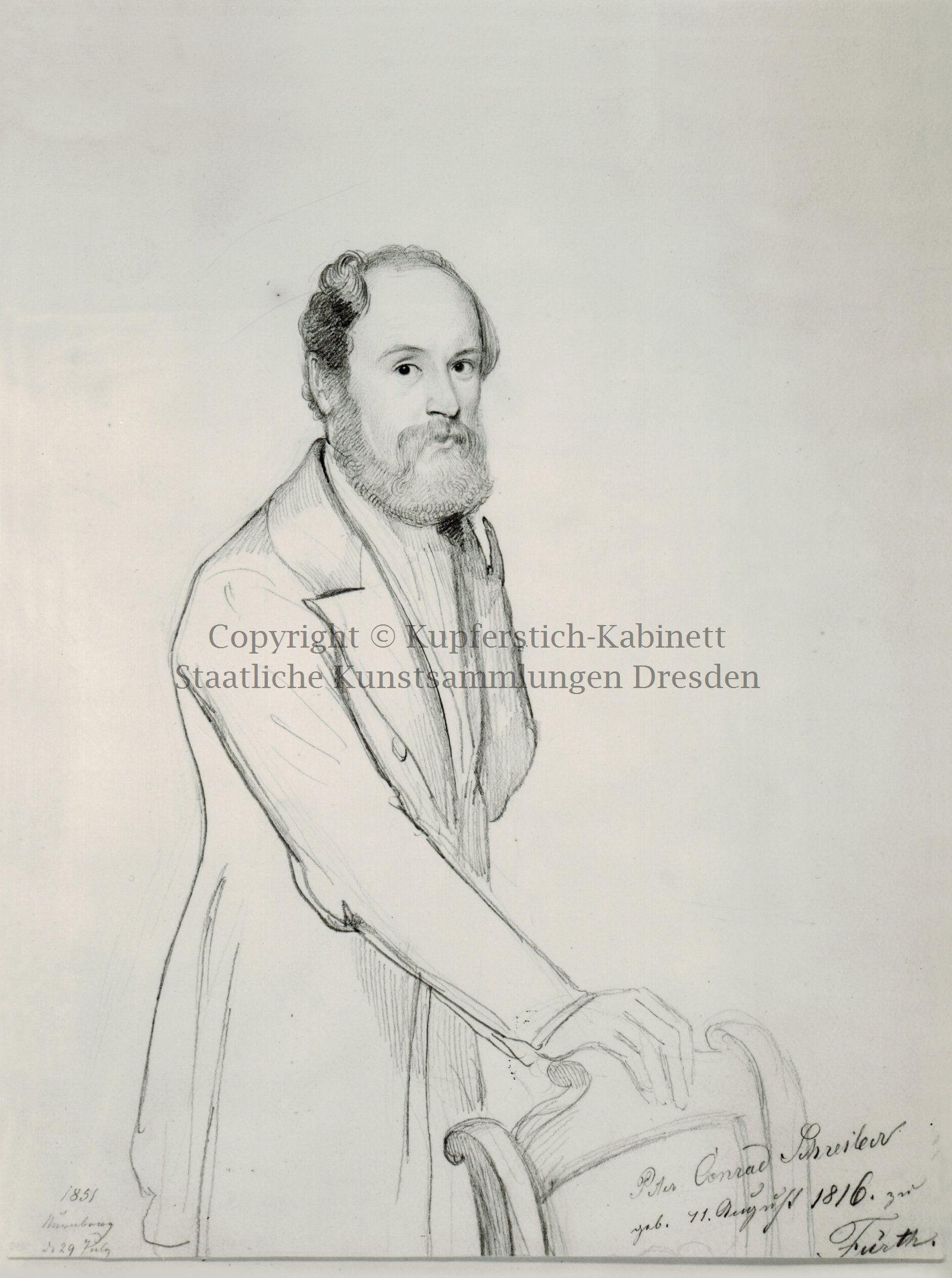 [65] Vogel von Vogelstein: Bildnis Conrad Schreiber, Inventar C 3407 (Negativ 20 648), Kupferstich-Kabinett, Staatliche Kunstsammlungen Dresden. Zur Porträtsammlung in Dresden: Weinrautner, Ina, Die Sammlung von Porträts von Carl Christian Vogel von Vogelstein in Dresden. Magisterarbeit der Universität Bonn, 1990, insbes. S. 77 und 78.
