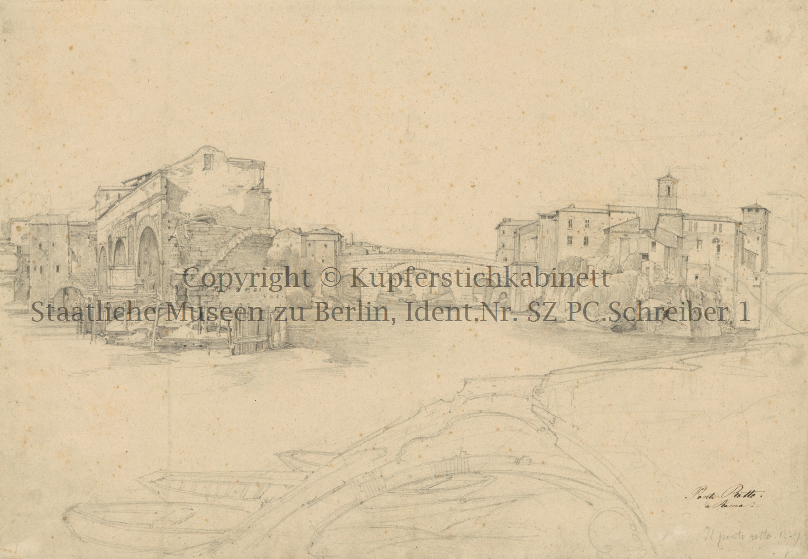 Die Annahme, dass sich Schreiber aber im Laufe des Jahres 1839 bereits in Rom etabliert haben muss, konnte im Zuge der Recherchen zu diesem Aufsatz zumindest indirekt weiter gefestigt werden. Zum einen mit dem bereits oben zitierten Passus aus genanntem bisher nicht bekanntem Brief vom November 1837 (Abb. B1)), wonach Schreiber im Frühjahr 1839 auf Wunsch seines Vaters nach Italien aufbrechen wollte oder sogar musste. Es ist davon auszugehen, dass er diesem Wunsch des Vaters folgte, zumal der Vater auch das Studium weitgehend finanzierte und daher ein gewisses Mitspracherecht hatte. Zum anderen ist die Ankunft 1839 indirekt belegbar durch eine Bleistiftzeichnung aus der Sammlung des Berliner Kupferstichkabinetts, die von Schreiber eigenhändig mit Ponte Rotto a Roma („Die zerstörte Brücke in Rom“ - Abb. 11) benannt ist, also von Schreiber stammt. Das Blatt konnte im Oktober 2015 im Kupferstichkabinett in Berlin eingesehen werden. Die von einer dritten Person handschriftlich vorgenommene zusätzliche Titelangabe und Datierung „Il ponte rotto 1839“ ist zwar nicht von Schreiber und damit auch nicht authentisch, die unbekannte Person kannte jedoch offensichtlich das richtige Datum, wenn auch aus bisher unbekannter Quelle. Schreiber dürfte im Ergebnis also bereits im Laufe des Jahres 1839 seine Zelte in Rom aufgeschlagen haben.
