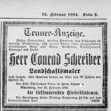 [25] Die Todesanzeige der Familie Schreiber - damals noch nicht so üblich wie heute - zeugt ebenso wie die sechsspännige Überführung des Leichnams zum (heutigen West-) Friedhof vom herausgehobenen Stand und Ansehen Schreibers in Nürnberg. Ebenso der Eintrag des Chronisten der Stadt Nürnberg am Todestag zu Leben und Werk Schreibers (Dok.5). Bildnachweis der Todesanzeige: Fränkischer Kurier, 19.2.1894. Stadtarchiv Nürnberg AvPer 709.