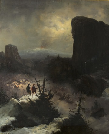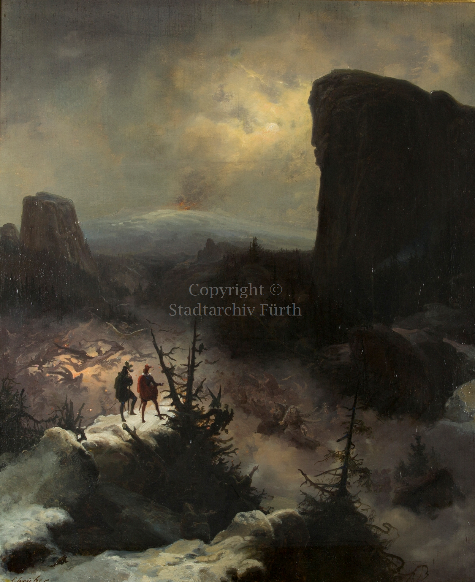 [5] „Walpurgisnacht im Harz“ wird dieses Bild im Bestand des Archivs Fürth genannt. Dass es mit dem im Akademiekatalog von 1838 genannten Bild „Der Blocksberg nach Göthe’s Faust“ identisch ist, ist wahrscheinlich. Bildnachweis: Städtische Sammlungen des Archivs Fürth. Signatur X 853.