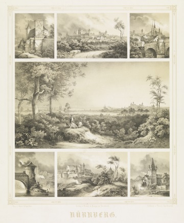 Die hohe Präzision und Sicherheit des Zeichnens, die sich Schreiber schon in den Berliner Jahren bei Schirmer aneignete, perfektionierte und bald absolut beherrschte, wird auch an einem von ihm um 1845 als zeichnerische Vorlage erstelltem Panoramablick auf das vorindustrielle Nürnberg mit der Kaiserburg im Zentrum deutlich, der zu einem bedeutenden Erlebnis der deutschen Romantik und auch Motiv zahlreicher, heute durchweg nicht mehr erhaltener Ölgemälde Schreibers von der Nürnberger Burg wurde. Um so wertvoller ist der Panoramablick mit Randbildern - erhalten als eine von Theodor Rothbarth (1816-1877) gefertigte Lithografie aus der Zeit um 1850 im Germanischen Nationalmuseum (Abb. 8).