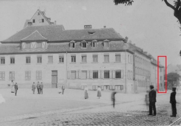 Am 11. August 1816 wurde nach dem Eintrag im Pfarrbuch von St. Michael Peter Konrad Schreiber als Sohn des Gürtlermeisters Johann Christoph Schreiber und seiner Ehefrau Katharina Barbara, geb. Hüttner, in Fürth geboren und am 25. August getauft. Als Taufpate wird der Riemenmeister Peter Konrad Walter aus Fürth genannt. Der Pate stammte also, wie es üblich war, aus derselben Schicht wie die Eltern. Laut dem zweiten Fürther Adressbuch von 1819 wohnte die Familie im Haus Nr. 275 in der damaligen Nürnberger Straße. Nach einer Straßenumbenennung und damit einhergehenden Neunummerierung im Jahre 1827 wurde aus der alten Adresse jetzt Königstraße Haus Nr. 393[2]. Auf einem Foto aus dem Stadtarchiv Fürth aus der Zeit um 1870 ist zumindest eine Ecke des stattlichen zweistöckigen Geburts- und Elternhauses Schreibers zu erkennen (Abb. 1). Das Haus wurde im Zuge des 1901 errichteten Stadttheaters abgerissen. Die heutige Adresse Königstraße 114 entspricht daher nicht dem früheren Elternhaus des Malers.
