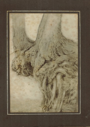 [7] Das Original war eine mit Kohlestift gezeichnete, nicht signierte, aber wohl von fremder Hand mit „1836“ datierte Studie einer Baumwurzel. Sie könnte im Unterricht bei August Wilhelm Schirmer in Berlin entstanden sein. Erhalten ist nur noch eine Fotoaufnahme vom Original. Der Fotograf war wohl der Sohn des Malers, Georg Schreiber. Bildnachweis: Familienbesitz.