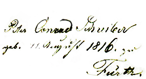 [54] Dass der gebürtige Fürther Christoph Johann Schreiber um 1783 zur Welt kam, erschloss sich bereits bisher aus diversen Gesellenbriefen, die Johann Christoph Schreiber in den Jahren 1803-1805 ausgestellt wurden. Siehe hierzu: Stadtarchiv Fürth Fach 18a, S 348. Aus einem jetzt gefundenen Randvermerk auf dem Trauungseintrags von 1807 geht hervor, dass der Bräutigam Johann Christoph Schreiber am 16.06.1783 in Fürth (Nr. 234 S. 599) geboren wurde. Siehe PfA Fürth-St.Michael KB 9.5.0001 - 321 44, 1807 S. 183 Nr. 36
