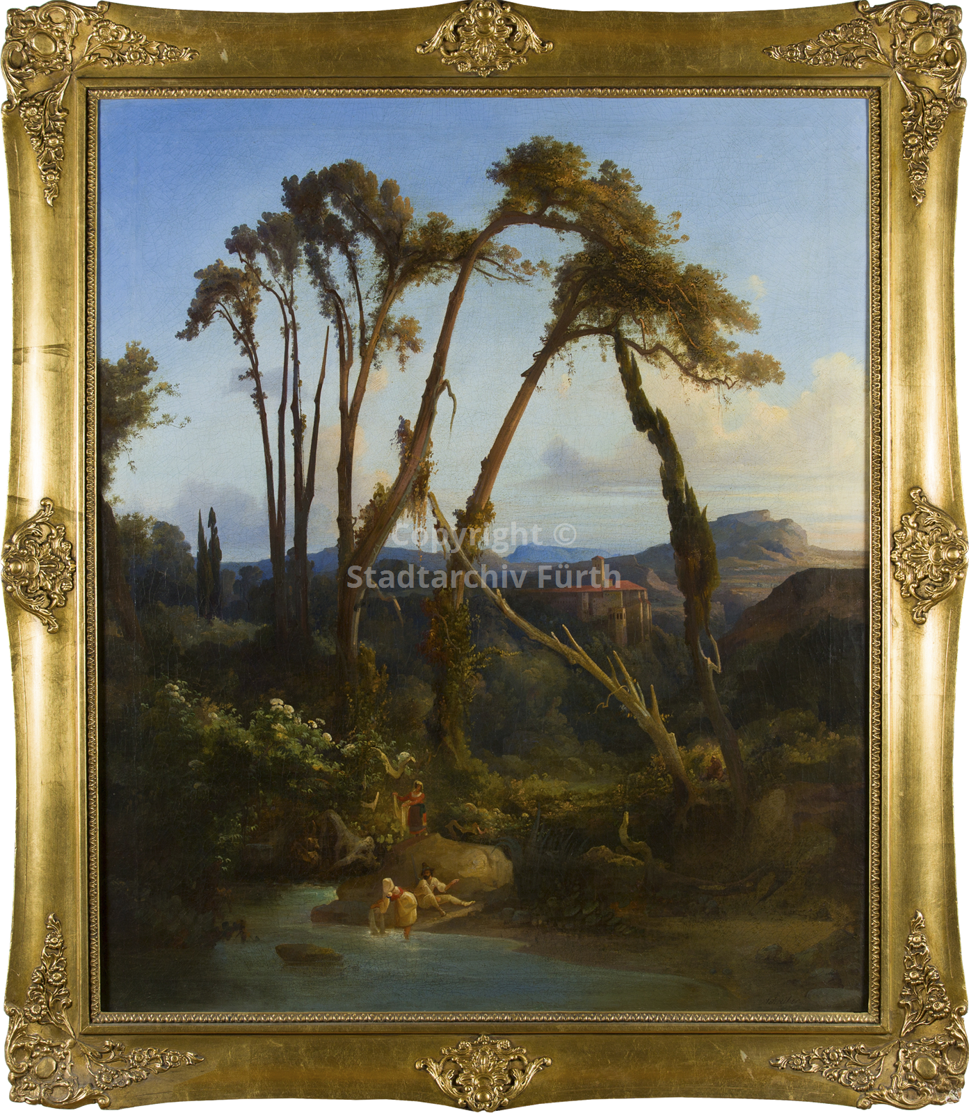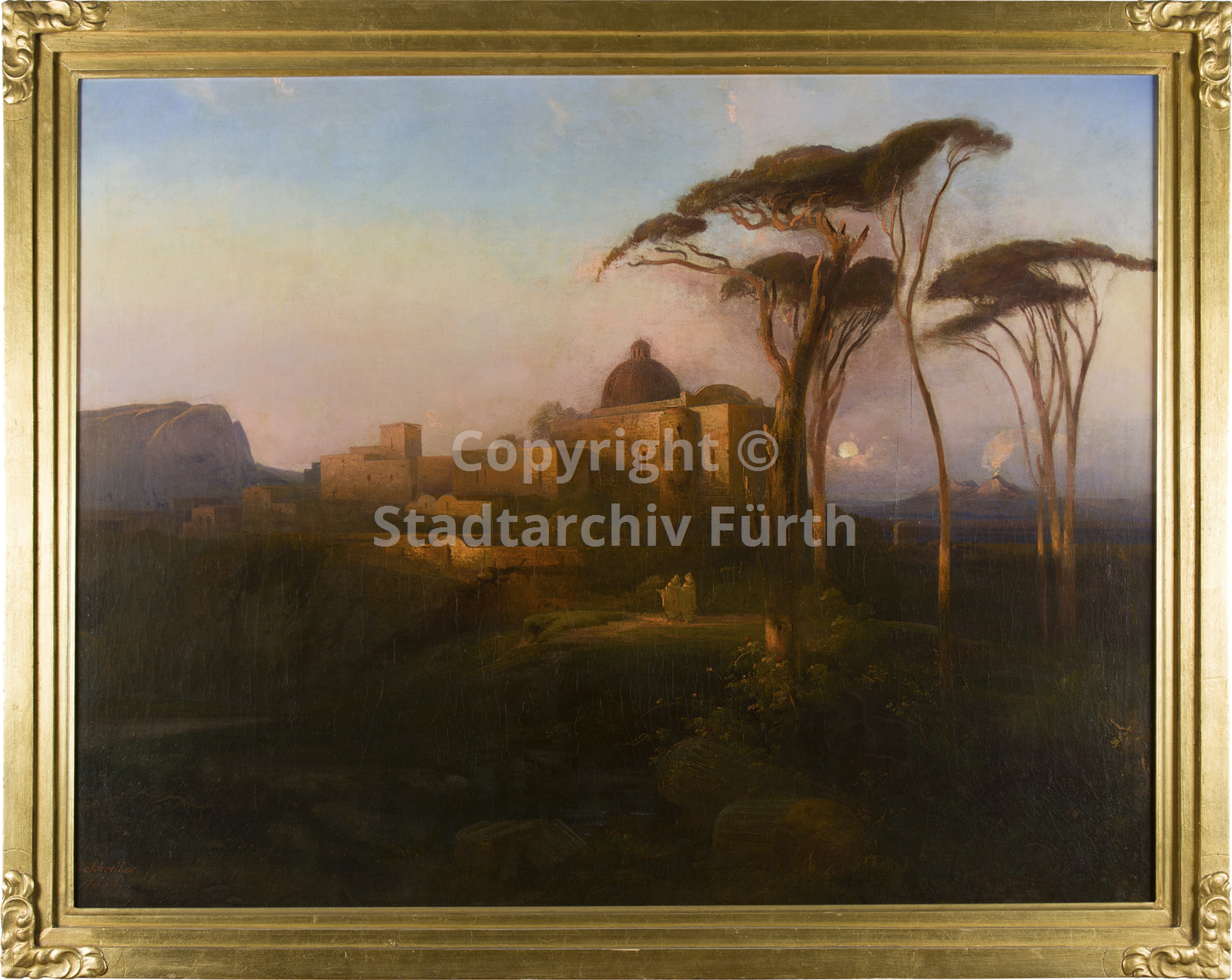 Beschreibung Auszug aus dem Virtuellen Museum Nürnberger Kunst - Eintrag mit Ergänzungen aus dem Nürnberger Künstlerlexikon, herausgegeben von Manfred H. Grieb: Sein Bild "La Cervara in der römischen Campagna", das er im Albrecht-Dürer-Verein ausstellte, wurde vom Rezensenten im Nürnberger Kurier vom 29.8.1842 gelobt: „In warmem Tone ist „La Cervara in der römischen Campagna" Nr. 131 von Schreiber in Fürth gehalten; eine dargestellte Natur, wie sie öfter von Reisenden mit Enthusiasmus geschildert wird, welche Italien besucht haben. Tiefblauer Himmel, der sich in den Seen des schönen Landes spiegelt, und ein Sonnenschein, der den klarsten durchsichtigsten Tag und die mannigfaltigsten Farbenspiele erzeugt.“