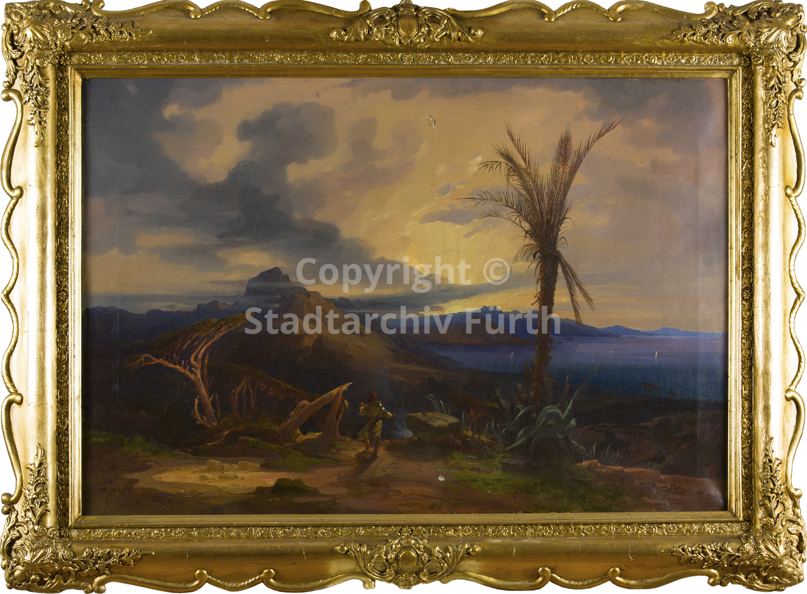 Beschreibung Mediterrane Küstenlandschaft bei Sonnenuntergang mit einem Wanderer im Vordergrund. Das Bild ist in einem vergoldeten Stuckrahmen gerahmt