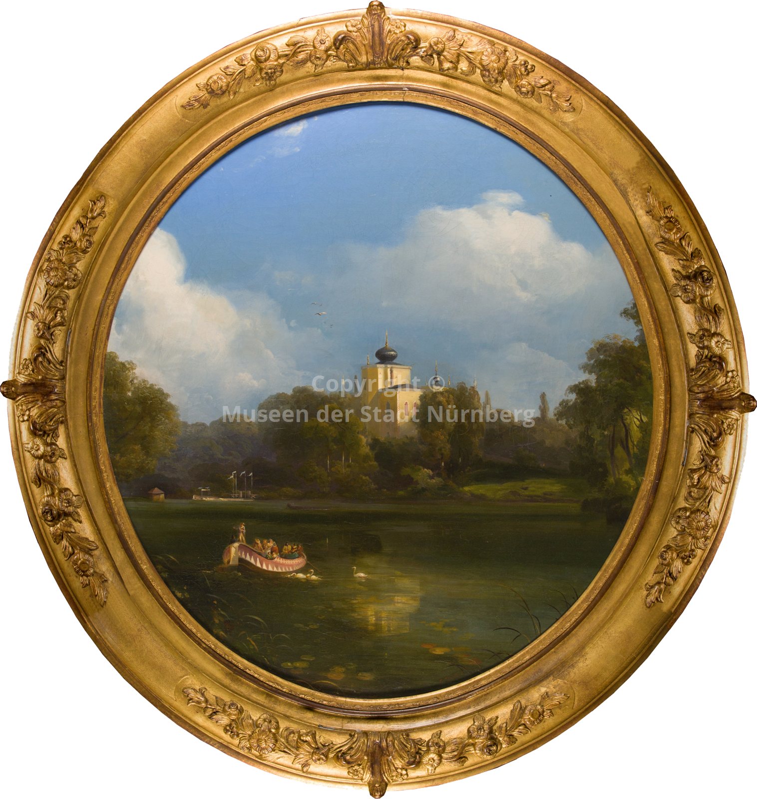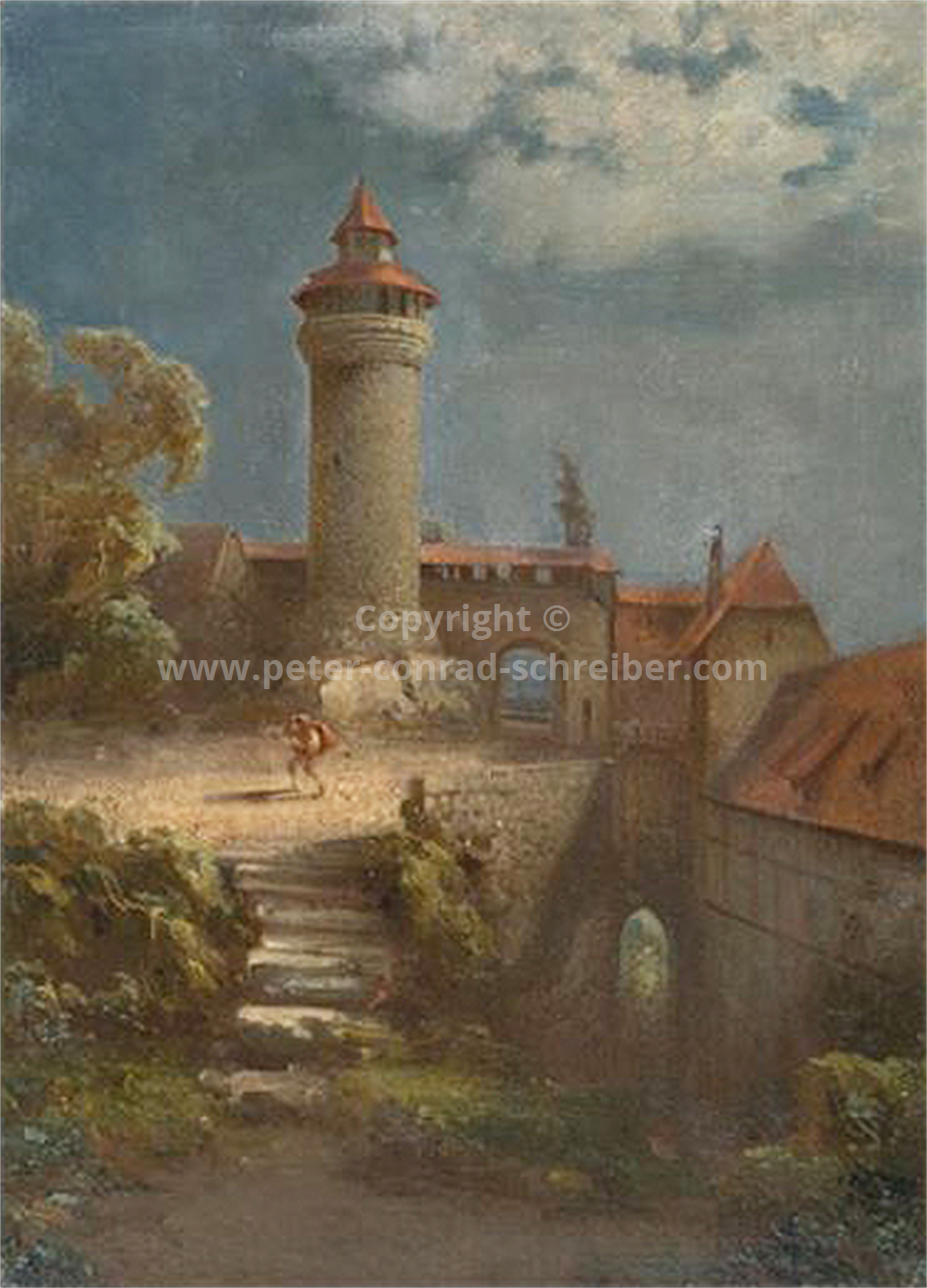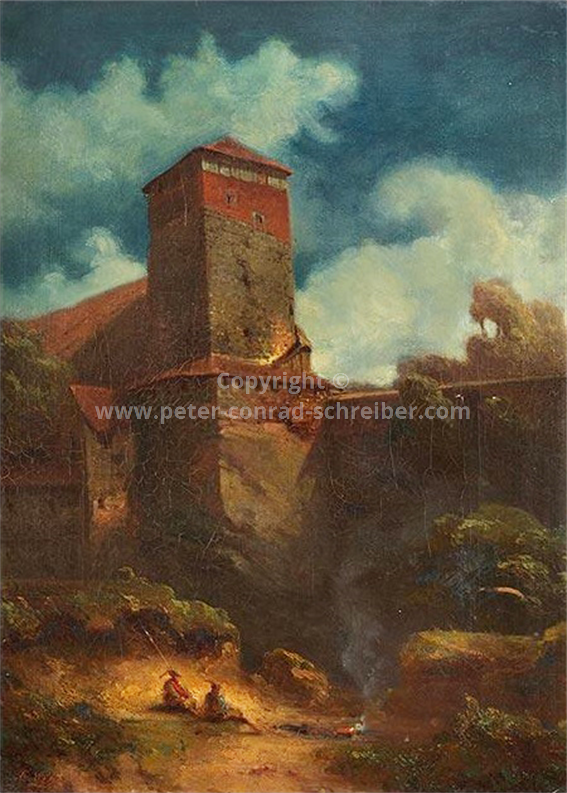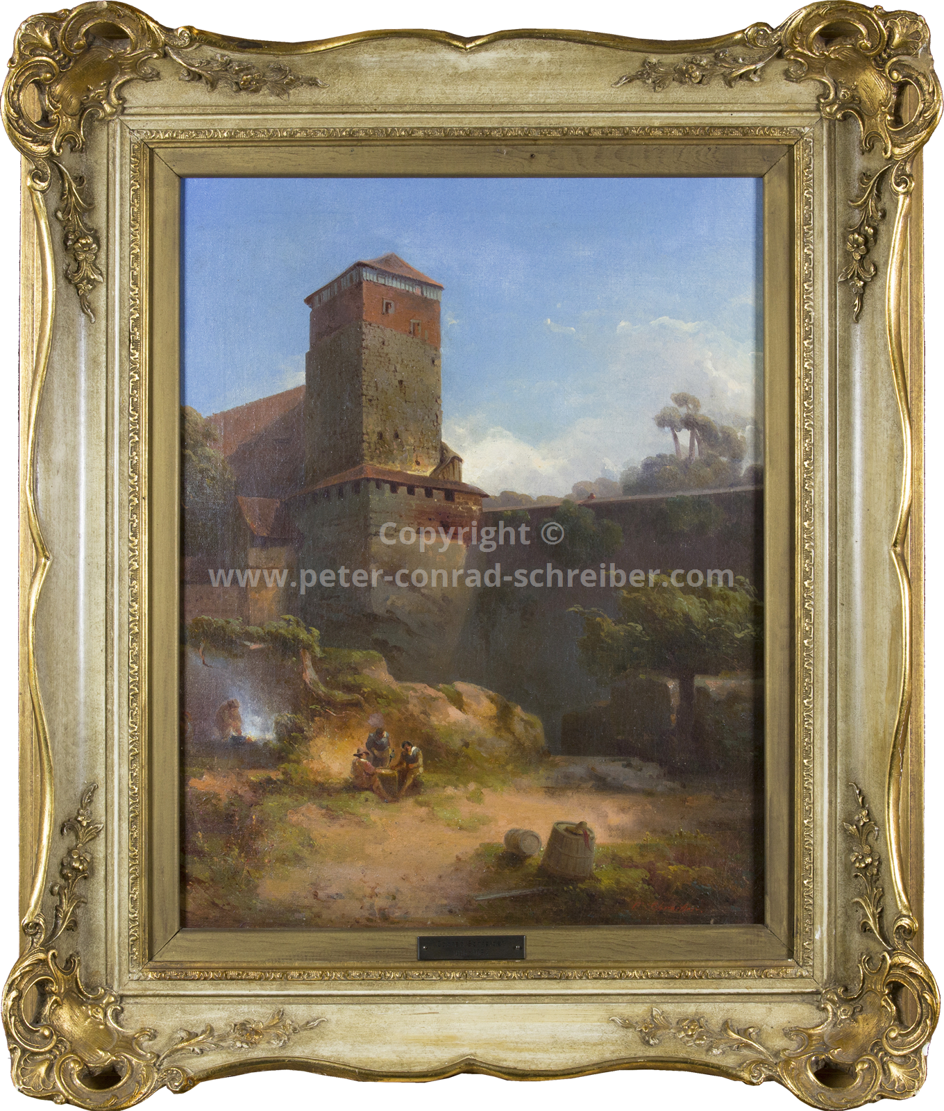 Beschreibung Ein Rezensent schreibt am 31.01.1844 in der ‚Nürnberger Zeitung‘: „In dem Albrecht-Dürer-Hause ist gegenwärtig ein Ölbild ausgestellt, das nicht umsonst seiner vielen Vorzüge wegen das allgemeine Gefallen anspricht. Es ist dies die von Schreiber gemalte Burg zu Nürnberg mit mittelalterlicher Staffage, welche dem Bild einen ganz bestimmten Ausdruck romantisch-historischen Charakters verleiht. Die Burg selbst leuchtet aus dem Dufte eines schönen Herbstmorgens heraus und die Sonne schlägt die leichten Streifen eines flüchtigen Nebels über die Mauerbrüstungen in den Stadtgraben hinab, während ein Zug von Rittern und Knappen in sorgloser Haltung über die herabgelassene Brücke sich bewegt. Das Bild zeugt von einer tiefen Konzeption des Künstlers und von sorgsamen Studien, die Natur in treuen Zügen wiederzugeben; das Poetische der Staffage war aber ein glücklicher Gedanke des Malers, denn durch dieselbe gewinnt das Bild ungemein an lebensfrischer Gestaltung jener Zeit, in der Nürnberg auf dem Glanzpunkte seines Bestandes sich befand. Die architektonischen Formen des Gemäldes sind der Gegenwart entnommen, nur die Pfeiler der Zugbrücke, welche den Effekt des Ganzen steigern, sind aus der Vergangenheit hinzugesetzt worden. Der Künstler, der bisher Muße und Fleiß zur Darstellung italienischer Landschaften verwandte, hat durch dieses Bild einen energischen Beweis geliefert, dass er auch deutsche Landschaften zu malen versteht, deren Ton zwar nicht so heiß als bei jenen, aber doch noch warm genug gehalten sein kann, um dem Auge als äußerst wohlgefälliger Gegenstand zu erscheinen. Das Gemälde wird die verdiente Anerkennung von Künstlern und Kunstfreunden erhalten. Es steht zu erwarten, dass der Albrecht-Dürer-Verein das Bild ankaufe, da gerade in Nürnberg ein hohes Interesse für dasselbe vorhanden sein muss.“