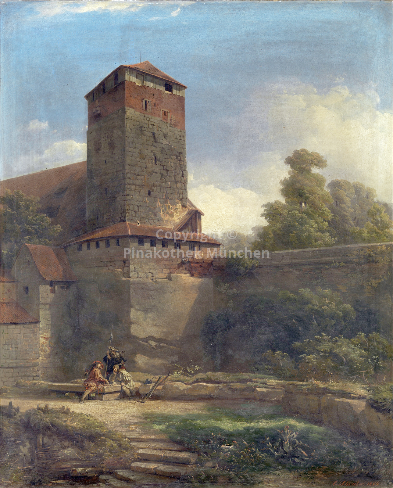 Beschreibung Darstellung des Fünfeckturms der Nürnberger Kaiserburg. Die Türme sind prominente Bestandteile des Nürnberger Stadtbilds, mit historischem Bezug zum Mittelalter und der Burgarchitektur. Vermutlich ist dies ein Entwurf für die Gemälde ID 251 und ID 427. Pendant zu ID 255