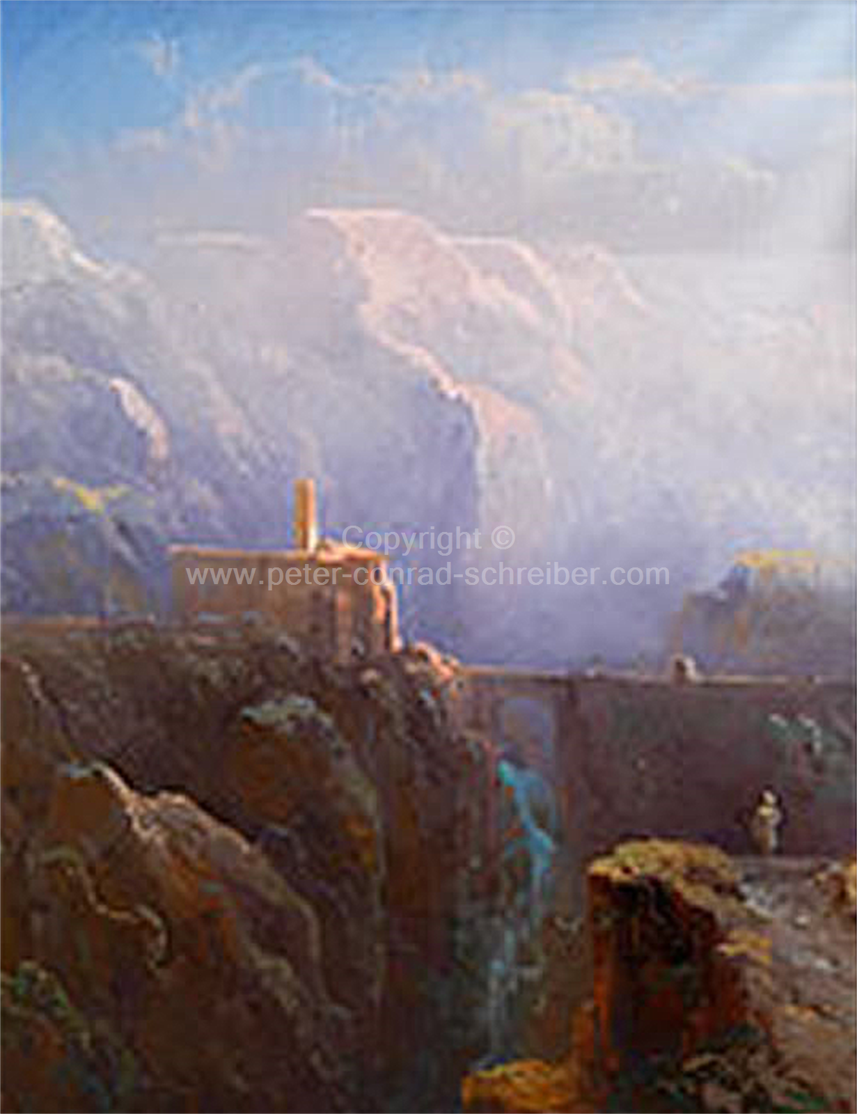 Motiv/Thema Italienische Gebirgslandschaft mit Gebäuden und einer Brücke über eine Wasserfallschlucht