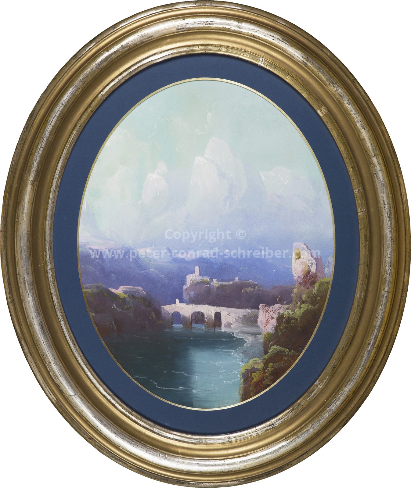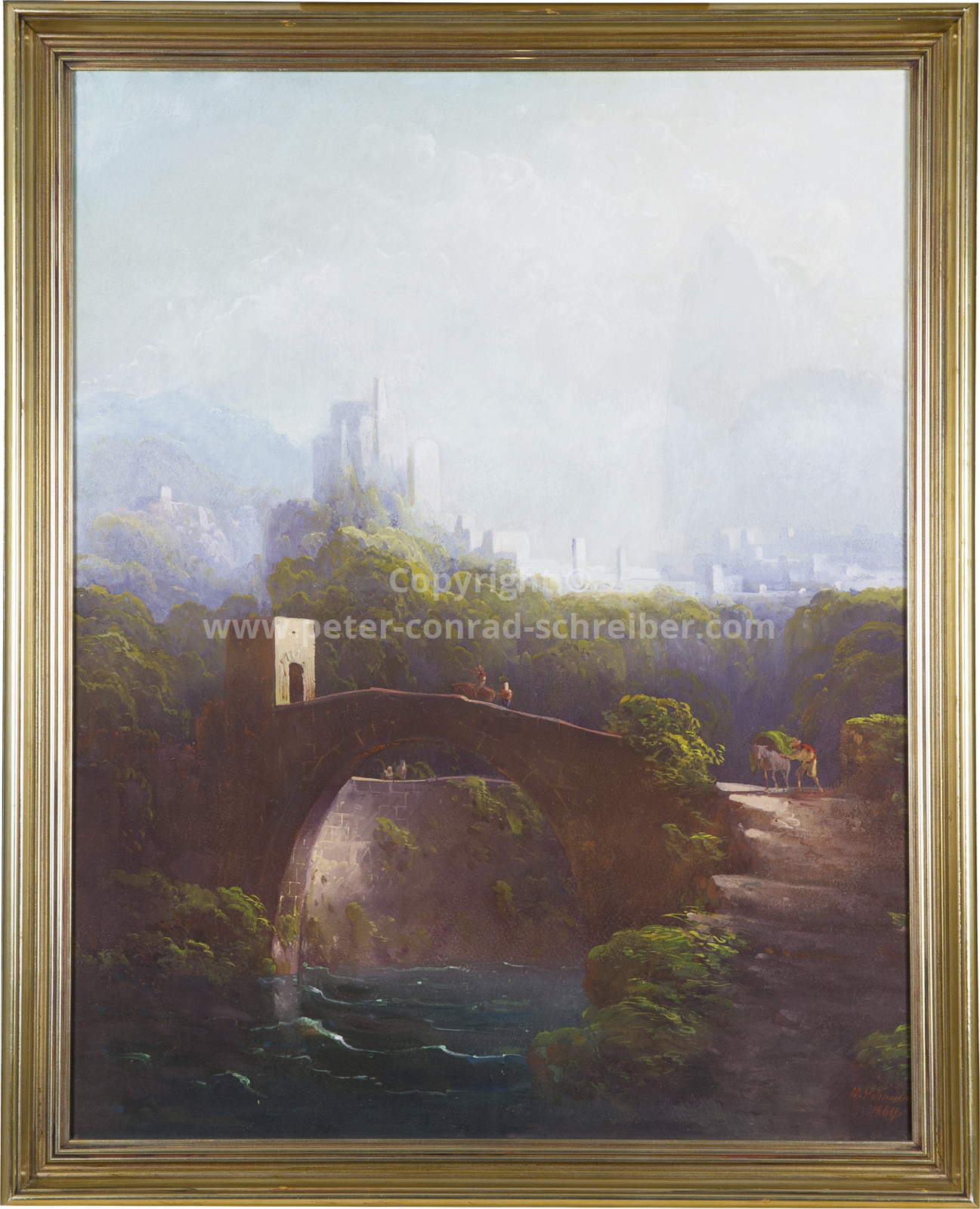 Beschreibung Vorne links ein Reiter, weiterer Blick fällt auf eine Brücke über den Tiber. Im Hintergrund verschneite Berglandschaft. Ähnliches Motiv, siehe ID 332