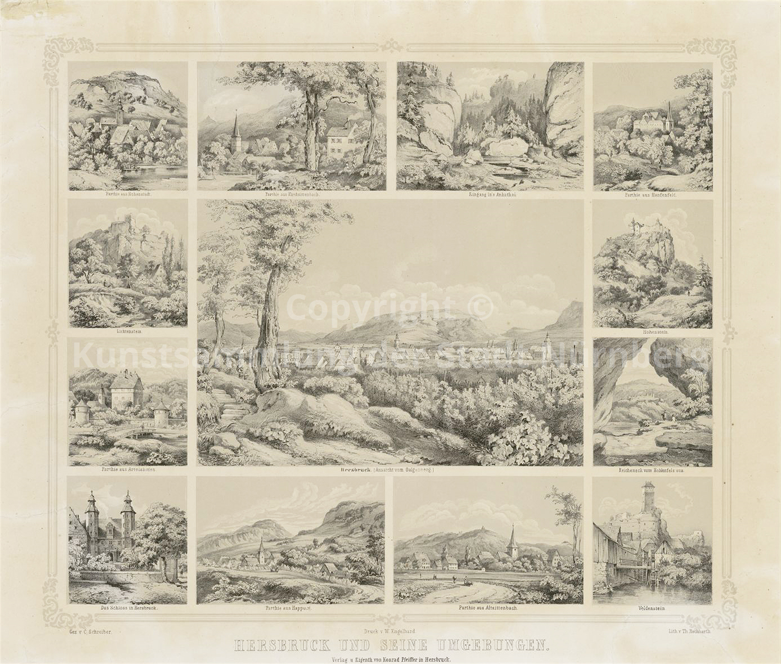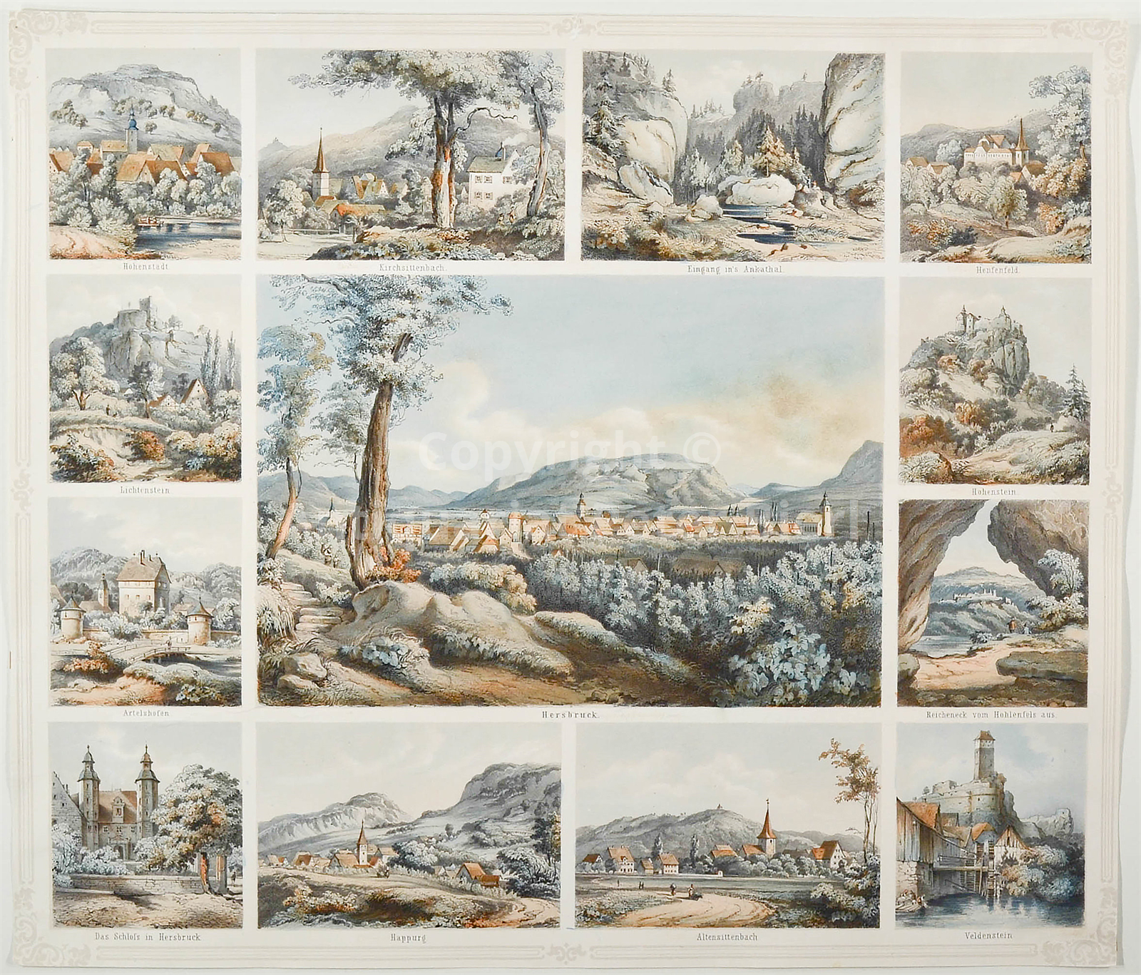 Beschreibung Große altkolorierte Lithografie von Th. Rothbarth nach Zeichnung von P. C. Schreiber. Ansichten von: Hohenstadt, Kirchsittenbach, Eingang ins Ankathal, Henfenfeld, Lichtenstein, Hohenstein, Artelshofen, Reicheneck vom Hohenfels aus, Schloss in Hersbruck, Happurg, Altensittenbach